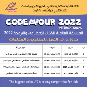 جدول ورش العمل للمعلمين و المعلمات للمسابقة العالمية للذكاء الاصطناعي و البرمجة