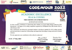 حصل مركز الكويت التعاوني للبرامج الطلابية على شهادة التميز الأكاديمي في المسابقة العالمية للذكاء الاصطناعي والبرمجة Codeavour 2022 والتي نظمتها مؤسسة STEMPedia بجمهورية الهند في الفترة من ديسمبر 2022 إلى مارس 2023 وذلك لتدريبه الطلبة وتحفيزهم بشكل مستمر وفعال على تطوير كفاءتهم في الذكاء الاصطناعي والبرمجة.