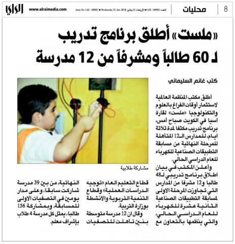 أطلق مكتب المنظمة العالمية لاستثمار أوقات الفراغ بالعلوم والتكنولوجيا «ملست» لقارة آسيا في الكويت برنامج تدريبي لمدة ثلاثة أيام بداية من 30 و حتى 1 فبراير 2018  للمدارس ال12 المتأهلة للمرحلة النهائية من مسابقة التطبيقات الصناعية للكهرباء للعام الدراسي الحالي 2017 / 2018 وذلك ضمن البرنامج تدريبي ل48 طالبا و12 مشرفا من المدارس التي تجاوزت المرحلة الاولى للمسابقة والتي ينظمها مكتب المنظمة العالمية ملست بالتعاون مع قطاع التعليم العام «توجيه الدراسات العملية» وقطاع التنمية التربوية والأنشطة بوزارة التربية.