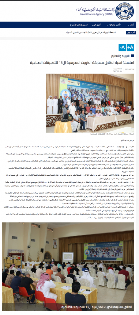 أطلق مكتب المنظمة العالمية لاستثمار أوقات الفراغ بالعلوم والتكنولوجيا ملست لقارة آسيا بدولة الكويت بالتعاون مع وزارة التربية وبدعم من مؤسسة الكويت للتقدم العلمي صباح اليوم 9 أكتوبر 2019 فعاليات مسابقة الكويت المدرسية الثالثة عشر في التطبيقات الصناعية للعام الدراسي الحالي باجتماع تنسيقي وفني عام لنحو 50 من مدربي التطبيقات الصناعية من معلمي المرحلة المتوسطة بنين بوزارة التربية.